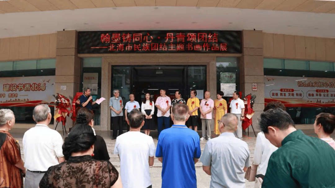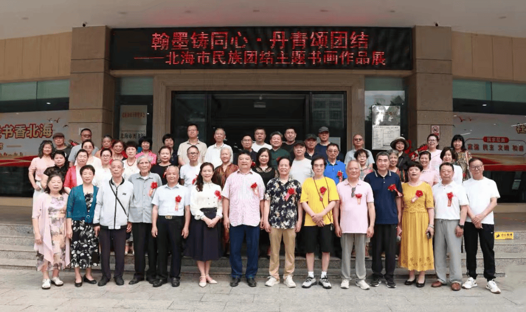 4月7日,由北海市旅游文体局、北海中华文化促进会主办,北海市图书馆、北海中华文化促进会书画院、北海夕阳红书画联谊会承办,北海市旅居者联合会、旅居文艺家工作室、北海市回头客食品有限公司、广西军民融合红色书画家委员会协办的“翰墨铸同心・丹青颂团结”——北海市民族团结主题书画作品展在北海市图书馆隆重开幕。