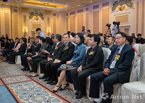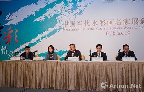 新闻发布会现场,左起:中国美术家协会水彩画艺术委员会副主任梁宇、弘宝博艺文化有限公司董事总经理常红女士,中国美术家协会副主席许钦松、金沙中国有限公司董事会特别顾问梁宝荣、澳门美术家协会会长黎鹰
