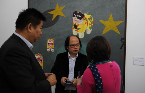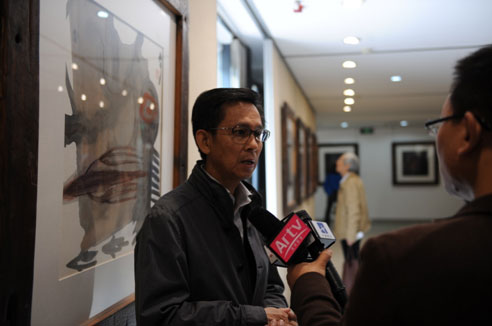 中国美协副主席何家英在周韶华展览现场接受采访 钱晓鸣/摄