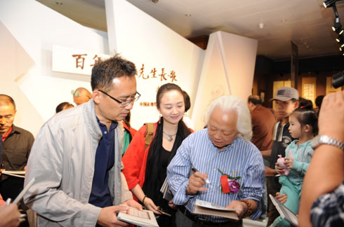 吴山明先生为热情的观众在作品集上签名 钱晓鸣/摄