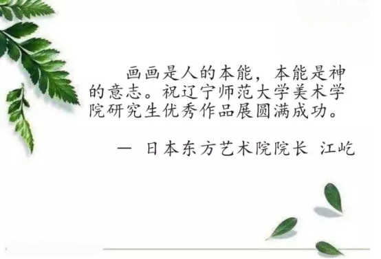 在展览发起之初,就得到了辽师美院领导及社会各届的大力支持,作为本次展览的学术主持,辽宁师范大学美术学院对参展作品的筛选评审做了大量工作。这里还特别感谢辽宁省大连市青年美术家协会、大连市侨联文艺中心、大连晚报、日本东方艺术院等组织与新闻媒体。作为“东方・星”展览项目的特别支持——江屹艺术基金创始人、旅日艺术家东京画派代表江屹先生,特地从日本发来展览寄语,表达了他对祖国美术事业的发展寄予厚望。