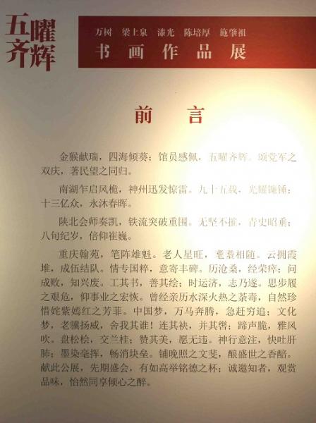 “五曜齐辉——书画作品展”开幕现场 “五曜齐辉——书画作品展”开幕现场 “五曜齐辉——书画作品展”开幕现场 “五曜齐辉——书画作品展”开幕现场 “五曜齐辉——书画作品展”展览前言 藏品艺术网重庆6月18日讯 近日,“五曜齐辉——书画作品展”在重庆文史馆开幕,书画家万树、梁上泉、漆光、陈培厚、施肇祖等五位艺术家作品参展,展览自6月14日开始展出,至7月14日结束,共将持续展出一个月时间。 部分参展作品欣赏: 参展作品 参展作品 参展作品 参展作品
