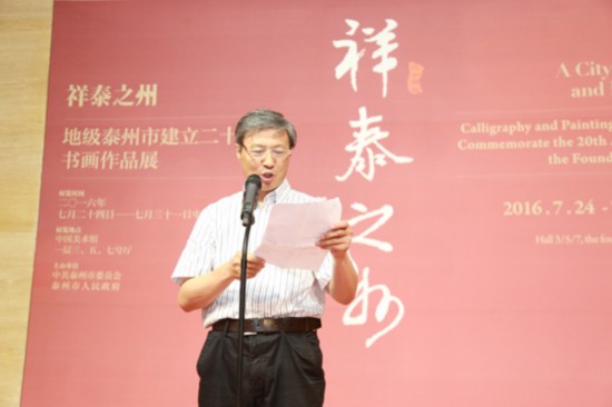中国美术馆7月25日讯 2016年7月24日,由中共泰州市委、泰州市人民政府共同主办的“祥泰之州——地级泰州市建立20周年书画作品展”在中国美术馆开幕。本次展览是为庆祝泰州市建立20周年所举办,通过130余件书画作品来展示泰州的悠久历史和文化底蕴,展现“泰州太美、顺风顺水”的自然风貌和人文风情。