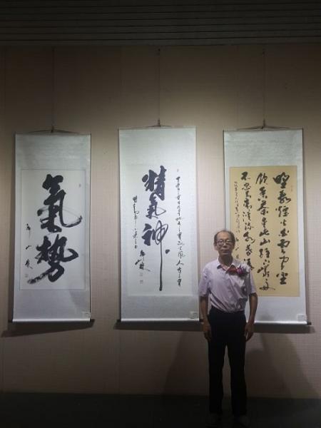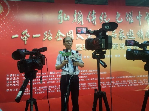2016年8月20日下午,“一带一路全国大型书画名家邀请展”北京首发站展在北京站东街通信大厦国艺美术馆隆重开幕。藏品艺术书画艺委会副秘书长、著名书法家韩山林创作的多幅书法作品受邀参展并引发关注。图为韩山林书画展上接受媒体采访。