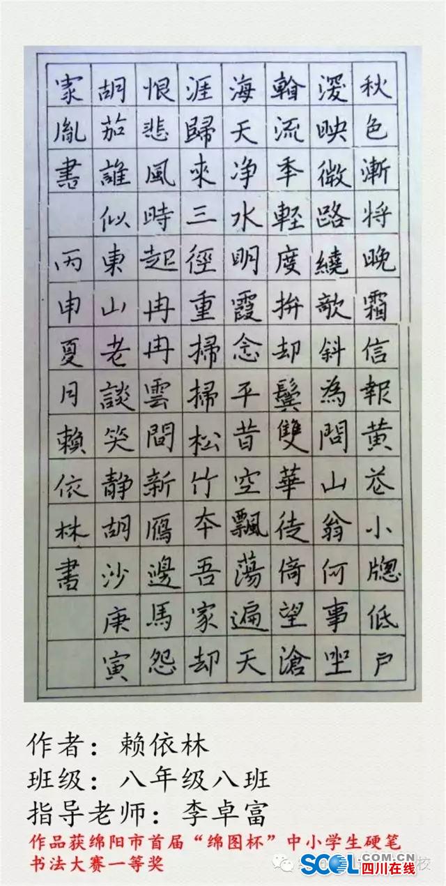 四川在线—绵阳频道讯(魏显 记者 刘毅)近日,由绵阳图书馆、绵阳市硬笔书法协会联合举办的绵阳市首届中小学硬笔(含毛笔)书法大赛圆满落下帷幕。经专家评审委员会严格评审,绵外实校作品从全市1841件作品评选中,脱颖而出,载誉而归:其中,赖依林、曾子航同学斩获一等奖,王永静怡等5位同学荣获二等奖,姚健君等17位同学获得优秀奖。同时,绵外实校林文娟、周媛媛、李卓富三位老师被评为优秀指导老师。 据了解,绵外实校始终坚持“培养充满智慧,具有民族意识和世界眼光的创新型人才”的育人目标,不仅注重教书育人,而且注重学生艺术才能的培养,特别是近几年来,学校把以书法教育为代表的艺术教育作为学校的办学特色来实施。此次比赛获奖,充分展示了绵外实校艺术教育的丰硕成果,体现了绵外实校对传统文化和民族艺术的的传承与弘扬,反映了绵外实校对学生全面素质培养的重视,激发了学生学习书法,弘扬中华国粹的积极性。