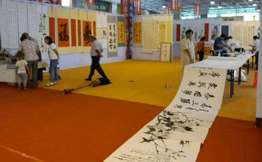 开幕仪式 传承国粹经典,弘扬书画艺术。近日,由中国奇石文化收藏协会、中国书画家杂志社主办,中国艺术品收藏鉴定中心书画创作基地、中国奇石文化收藏协会烟台地区分会承办的“2016翰墨丹青全国书画展”在莱州国际会展中心举办。9月9日开幕,9月14日落幕,展期5天。展出作品近200幅,以多样的风格和多元的话语,诠释了书画家们对艺术的思索和对生活的领悟,传承创新,翰墨飘香。 据中国奇石文化收藏协会副主席、中国艺术品收藏鉴定中心副主任、中国书法家协会会员沙守江总策划介绍,来自全国各地1000多幅作品中遴选出近200幅书画作品参加此次展览,开幕式当天有王法令、周远怀等相关领导出席,展会上有欧阳中石、张海、苏士澍,中国书画家杂志社社长史家治及军旅书画家吴碧林、经富春等名家作品荣誉展出,还有知名书画家曲云德、郭金晓、刘永强、丁坐京、毛东文、刘连泰及当地书画家周世明、王少济、王勇麟、官泽源、姜信等50余人参加展会,并挥豪泼墨。(王松兴)