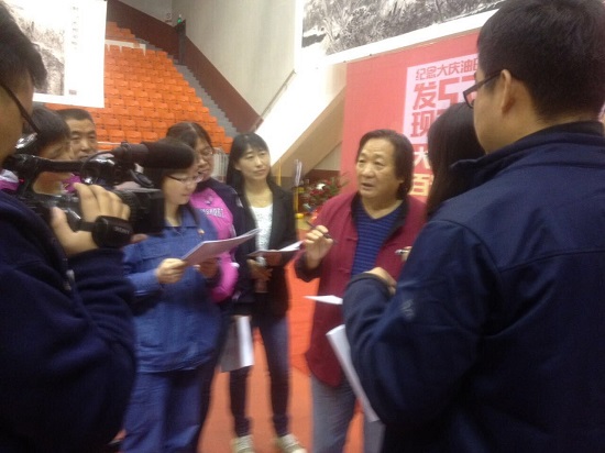 战广彦画展现场 战广彦画展现场 战广彦接受媒体采访 战广彦接受媒体采访 藏品艺术网大庆9月27日讯 为纪念大庆油田发现57周年,由大庆市委宣传部、市总工会、油田党委宣传部、油田公司工会主办的“纪念大庆油田发现57周年暨战广彦油田会战百米长卷画展”昨天在龙南体育馆开展。 据悉,此次展出的作品《石油大会战》巨幅长卷,长108米,高2.4米,作者为亲身经历大庆石油会战的中国美协会员、国家一级美术师、原大庆市美协副主席战广彦先生。他用笔墨艺术的表达方式,将100多位石油工人的形象布局在长卷上,形象逼真地再现当年石油会战历史场景。