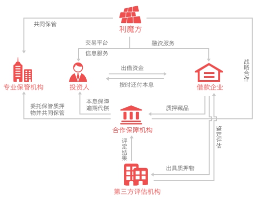 通过上图可以看到,借款人(或者借款企业)在经过利魔方层层审核后,将自己的珍藏多年的藏品(比如徐悲鸿的《林荫闲憩图》)进行质押,从而在平台进行借贷,到期之后借款人归还本息。而广大投资人通过平台进行投资,到期后可以获得投资收益。如此一来,实现多方共赢。