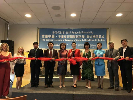 “大美中国——走进联合国首届书画艺术展”于6月22日,在联合国大厦内举行了隆重的开幕式。开幕式由联合国教科文组织纽约协会主席李依凌女士主持。斯洛文尼亚常驻联合国代表团大使夫人、雕塑艺术家Cvetka Logar 女士、 中美文化交流协会会长罗嫚女士、大美中国文化交流平台创始人张荔鹃女士、参展画家石砚洗、邢连海、杨国峰(画家卢倩女士代理人 ) 、段成金先生共同为开幕式剪彩。开幕式上,中美商务顾问集团公司首席执行官 TOM Tao( 陶铁)先生、中美文化交流协会会长罗嫚女士先后致辞,大美中国文化交流平台创始人张荔鹃女士发表答谢致词 。随后,本次参加展团长石砚洗先生、参展画家邢连海、杨国峰(画家卢倩女士代理人)、段成金先生分别发言并介绍画作。