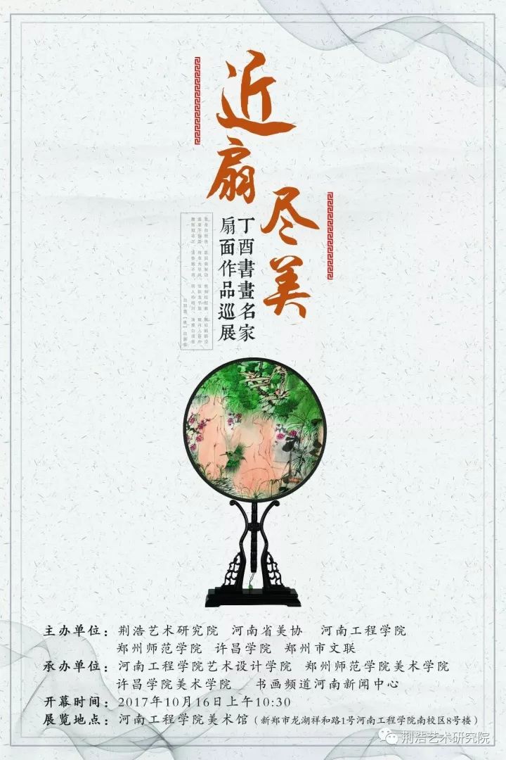 10月16日,“近扇尽美——丁酉全国书画名家扇面作品展”在河南工程学院美术馆隆重开幕。本次展览由荆浩艺术研究院、河南省美术家协会、郑州师范学院、河南工程学院、许昌学院、郑州市文学艺术界联合会主办,河南工程学院艺术设计学院、书画频道河南新闻中心承办,荆浩艺术策展中心、古柏(上海)服饰有限公司郑州公司协办,旨在喜迎党的十九大胜利召开,庆祝河南工程学院更名升本十周年。