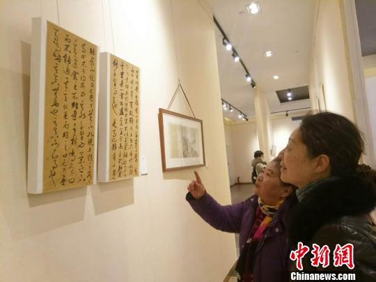 1月12日,兰州市民李文华和刘侠在欣赏“陇右新裁——甘肃省青年书画作品九人展”的作品。习书法近十年的刘侠十分钦佩青年才俊能将最难临摹的草书练的行云流水。 闫姣 摄