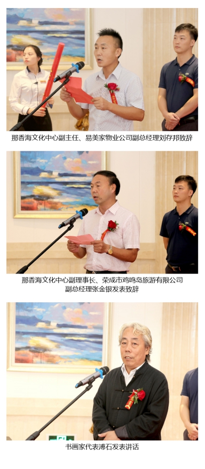 北京书画联展开幕仪式上,那香海文化中心副主任、易美家物业公司副总经理刘存邦首先致辞,他表示文化是那香海始终坚持塑造的核心软实力,本次北京名家书画联展便深刻体现了这一理念,那香海不仅提供物质上美好的享受,而且不断打造精神文化上的美好享受,让广大游客与业主全面体验那香海景区的魅力所在。随后,那香海文化中心副理事长、荣成市鸡鸣岛旅游有限公司副总经理张金银发表致辞,他在致辞中表示,来自北京的书画大家为那香海献上了一场文化盛宴,为喜爱书画艺术的朋友提供了一个很好的学习交流平台,非常感谢五位书画名家为同好者带来墨宝精品。书画家代表溥石发表讲话,他表示非常感谢那香海为书画联展提供的有力支持,并希望本次展出圆满成功。