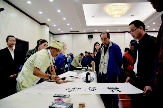 在当天下午举行的“诗画关山·心仪华亭”九省13市、县、区书画笔会联谊活动上,来自江苏省南京市江宁区、江西省武宁县、云南省普洱市景谷傣族彝族自治县、陕西省陇县、甘肃省清水县、甘肃省平凉市崆峒区、甘肃省庄浪县、甘肃省华亭市的40余名书画家们共聚一堂,进行书画创作交流活动。书画家们挥毫泼墨,用自己的艺术感触,歌颂陇原大地、赞美山水华亭,尽情抒发他们的艺术情怀。书画爱好者们则近距离地欣赏到了书画家们挥毫运笔、皴擦点染的精彩瞬间和笔情墨趣。书画创作交流活动共创作书画作品150余幅,极大地满足了书画爱好者们的精神文化需求。