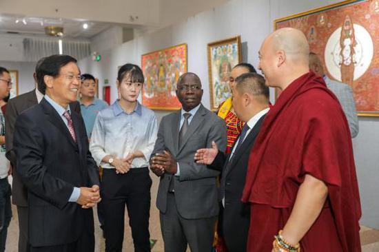 中国国际文化传播中心第一副主席吴昌德、莫桑比克文化与旅游部长席尔瓦·丹多罗与罗藏旦巴进行艺术交流