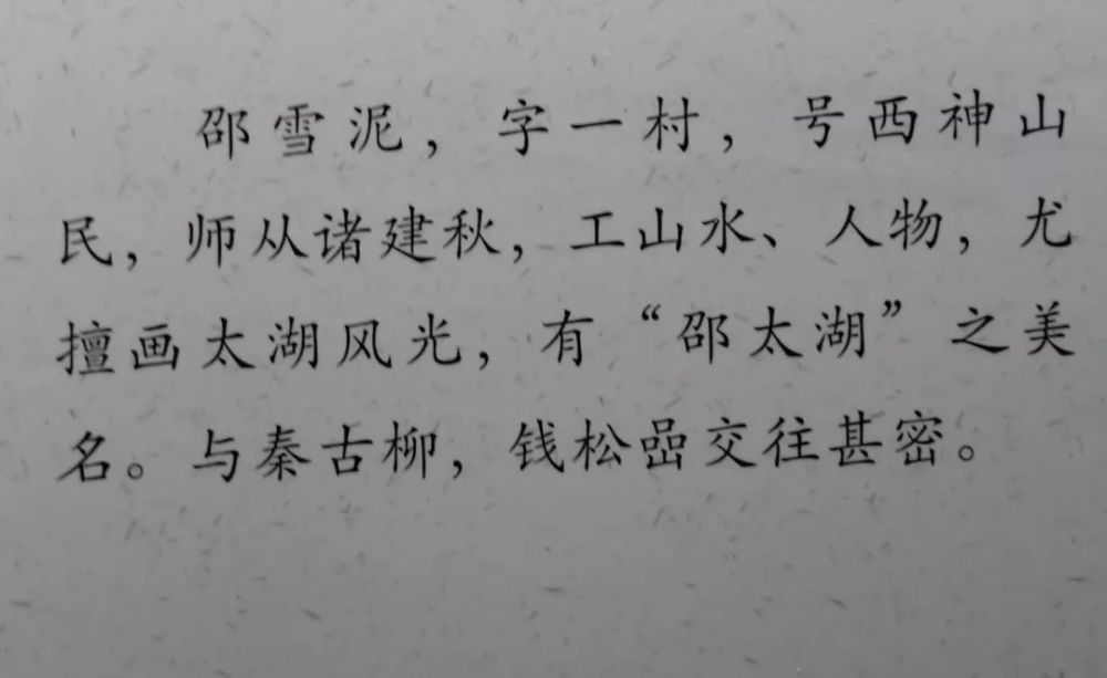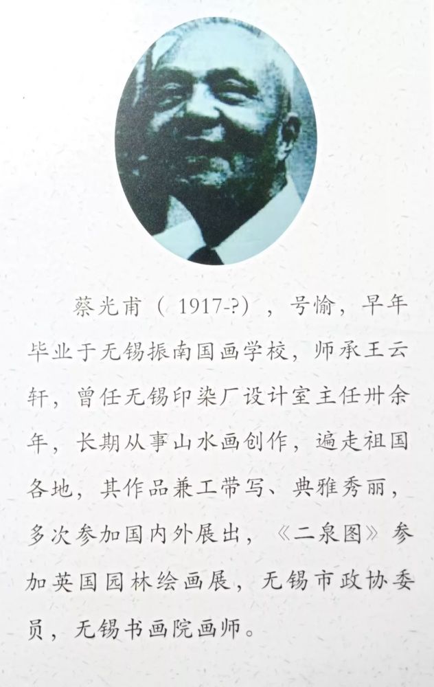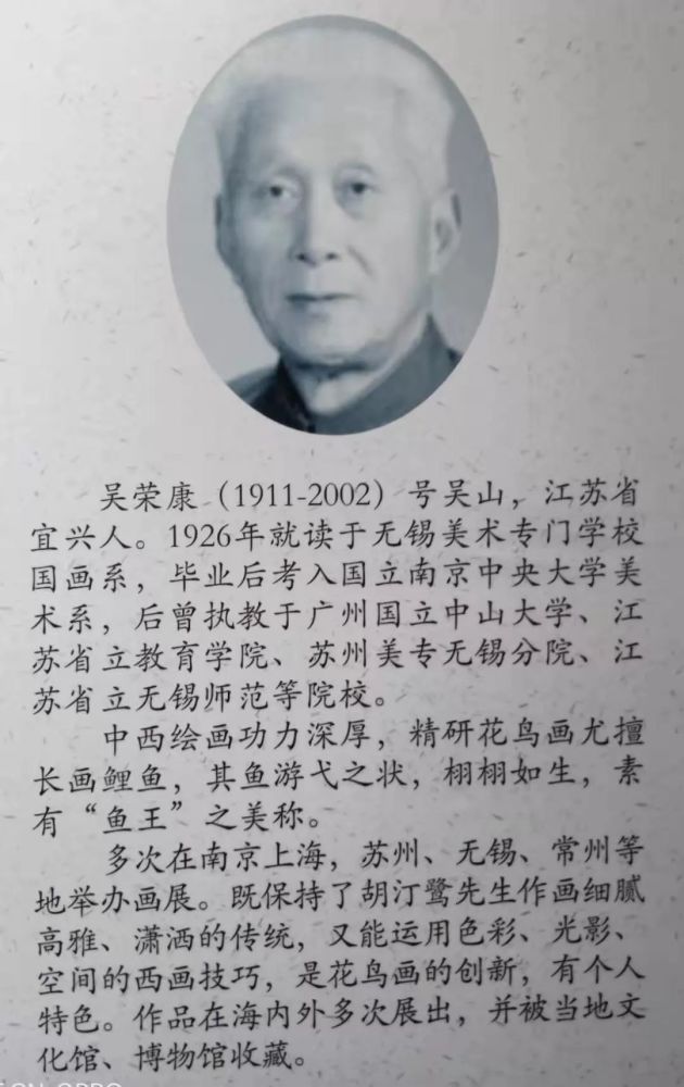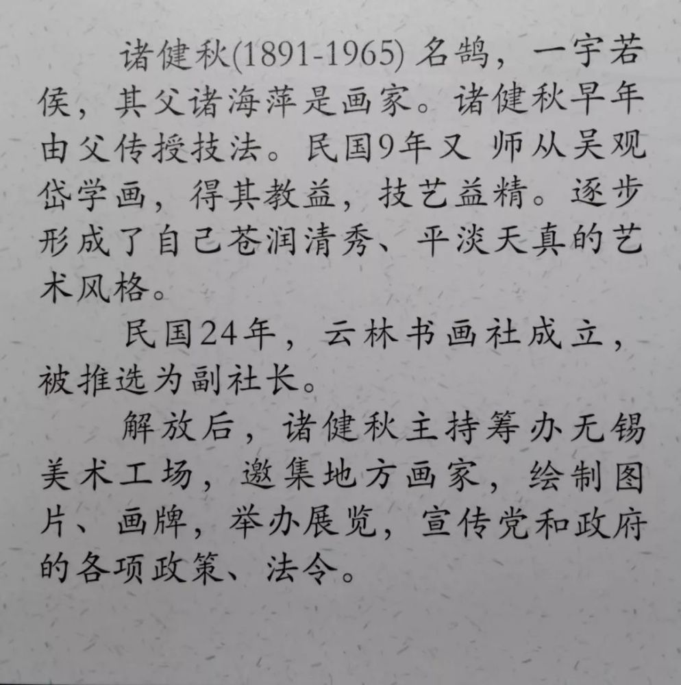 而秦古柳、诸健秋二先生,蛰居乡曲,不求闻达,笔墨格局,不在诸公之下。古柳先生喜山水,得石涛之纵逸,新罗之洒脱,而自然浑成,元气淋漓。健秋性敦厚,讷讷不善言辞,与古柳先生皆出吴观岱门墙,画则陈酣朴茂,一如其人。其他丹青好手如擅画芦荡之周怀民、好作云山之顾坤伯、独擅画鱼之陈旧村、长于画虎之孙葆羲,皆各擅其长,名重南北。此外如秦祖永、黄养辉、吴荣康、钱行健、唐原道、董欣宾、吴观涛、华日曾、顾淑梅、钱晴碧、蔡光甫、华文汇、秦淦、姚墨林,以及晚进的杨齐南、裘国骥、华士清等,或工或写,或能或妙,成为近现代以来无锡画坛的璀璨繁星。