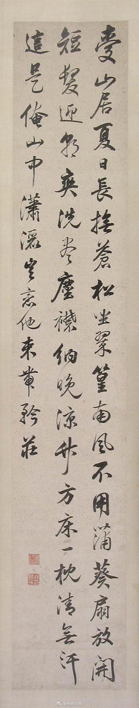 看了个展【沈阳故宫把珍藏书画拿出来让你感受夏天】6月9日,“夏香远溢——沈阳故宫藏书画展”在沈阳故宫开展。“绿树浓荫夏日长,楼台倒影入池塘”,30余幅馆藏夏季题材的书法绘画作品,给人带来夏天的别样情趣。作为夏日代表的荷花形象深受文人墨客的喜爱。本次展览中就有多幅荷花题材作品,其中“八大山人”朱耷的荷鸟图轴,荷茎修长,荷叶舒展,荷花摇曳,水鸟栖鸣,构图简健,用笔传神。 除花鸟画外,展览的第二单元、第三单元还展出了馆藏夏季题材的山水画、人物画。与“八大山人”朱耷同属“清初四僧”石涛的作品“清石涛长夏山居图轴”、海上画派代表画家“四任”任薰的作品“清任薰设色消暑图轴”均在本次展览中展出。书法作品方面,既有清代著名书法家陈邦彦的行书七言联,晚清大家王闿运的行书七言联,又有“民族英雄”林则徐的行书道情屏。(光明日报全媒体记者刘勇) 声明:转载此文是出于传递更多信息之目的。若有来源标注错误或侵犯了您的合法权益,请作者持权属证明与本网联系,我们将及时更正、删除,谢谢。