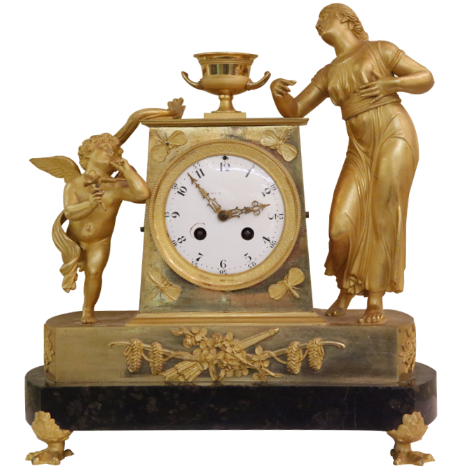 19世纪初帝国风格镀金铜钟 帝国风格,镀金铜钟,石头座。珐琅钟面,妇女和爱神天使,长34厘米,宽16厘米,高36厘米,带发条