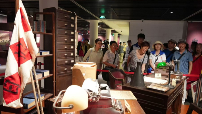 展厅中央还特别打造了“抗战时期上海报刊编辑部”实景还原展区。老式打字机、泛黄的稿件、隐蔽传递的报刊小样,生动再现了从孤岛时期到抗战胜利,上海文化工作者在敌伪监控与战火洗礼中坚守阵地的全过程。