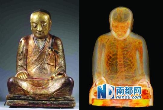 之前,荷兰一家博物馆为这尊有着上千年历史的中国古佛像做了C T扫描,发现佛像里面隐藏着一具保持着打坐的姿势“人体木乃伊”,而且其内脏已被掏空。新华社发