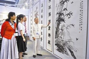▲方国兴向观众介绍他的作品。 深圳晚报讯 (记者 汪仕林 文/图)5月12日至16日,文博会福田区专项活动“春风·鹏城情——方国兴书画陶瓷精品展”在深圳会展中心6号馆举行,展出了方国兴的书法、绘画及陶瓷作品100件。江西省委常委、宣传部部长陈俊卿,广东省文化厅厅长方建宏,深圳市委宣传部副部长李瑞琦、福田区区长肖亚飞、福田区政协主席陈志新等领导出席了此专项活动。 方国兴是中国书法家协会鉴定评估委员,中国美术家协会会员,中国国画家协会常务理事,中国工艺美术家协会副主席,国家一级美术师,中央紫光阁画院院士,中国工艺美术大师评委成员。他书法四体皆擅,国画以书法入画,且以书画融于瓷艺,风格独具,有“书画瓷三绝”之誉。 本次展览精选方国兴主题作品系列有:春天、春风、春韵、和谐、平安、团结、奋斗等。不但有八尺巨幅中堂国画对联和十米长卷书法,还有扇面和瓷壶小品,并且首次将其中部分作品开发出衣服、水杯、文具等艺术衍生产品,如“雅兰趣竹杯”等,让文化艺术走近百姓,在珍贵的原作与大众艺术消费之间架起一座桥梁,让艺术改变生活,让艺术引领消费。