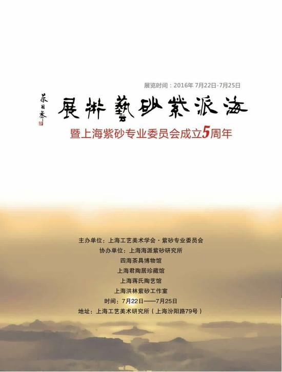 由上海工艺美术学会指导,上海工艺美术学会•紫砂专业委员会主办,上海工艺美术研究所、上海海派紫砂研究所、四海茶具博物馆、上海君陶居珍藏馆、上海蒋氏陶艺馆、上海洪林紫砂工作室协办的“海派紫砂艺术展暨上海工艺美术学会紫砂专业委员会成立五周年庆典”活动,于7月22日至7月25日在上海工艺美术博物馆(上海汾阳路79号)举行。