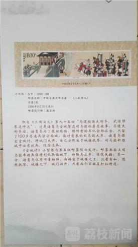 3月17日,《三国演义》系列邮票在六朝博物馆进行展出,吸引了大批市民前来观赏。此次邮展,集中了1988年11月至1988年8月的10年间我国政府部门连续发行的五组《三国演义》邮票、小型张,这也是我国迄今为止同一题材发行时间最广,枚数最多的系列主题邮票之一。 邮票的设计者陈全胜、戴宏海以中国工笔重彩话的形式,将三国演义人物故事栩栩如生定格在方寸之间。由于内容与艺术的完美结合,《三国演义》系列邮票拥有极高的收藏和鉴赏价值。