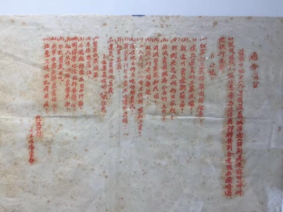 展览中有许多国内罕见的革命文物,收藏家张鹏展出了1935年1月,中国工农红军首次占领遵义城时,红军总政治部代主任李富春签发的通令原件。这则通令发布于1935年1月8日,其中公布了进遵义城时呼喊的十二条口号,明确了红军奋斗的目标;同时规定了军队进城的八项注意,这是迄今发现最早的我军军纪准则文件实物。