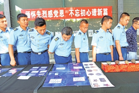 展品第二部分以威武钢铁长城为主题:包括红军当年使用过的文物、徽章、钱币等。现场一名军人说,自己当兵已经4年,回家的次数屈指可数,但家人从不抱怨,而是以他为骄傲。这次红色文物展览,让他对党的历史,军队的历史又有了新的了解和认识。