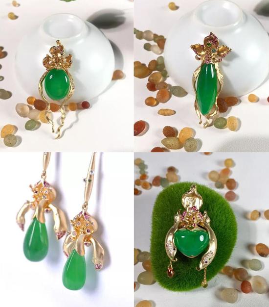 亮点:翡翠结合18K黄金加上红宝石蓝宝石让比较单一的翡翠变的更加华丽更加动人,让单一古典的翡翠变的更时尚。让翡翠不再是中老年人的专属翡翠也可以很时尚很年轻。
