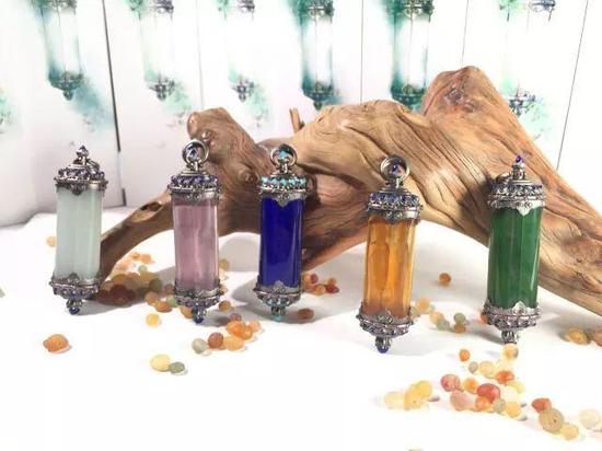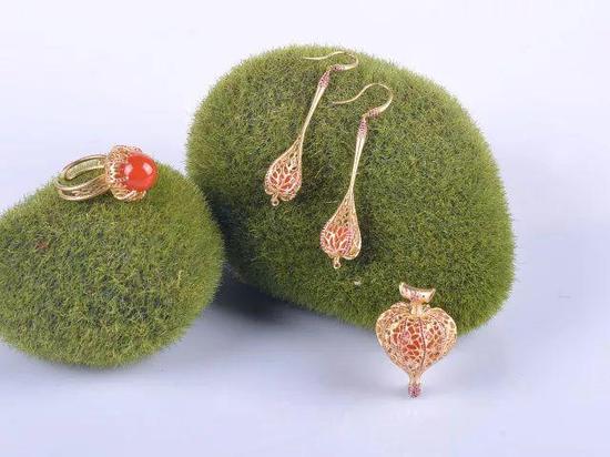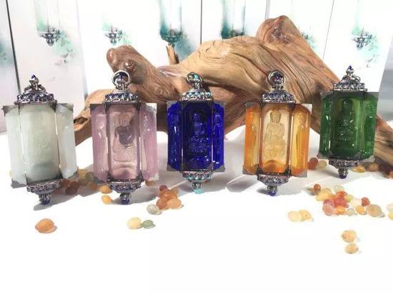 《心中有佛》 玉器的制作在漫长的发展过程中,主要体现了两种不同的审美追求。一种是追求材质之美,追求至大至高的朴素之美;另一种是追求玲珑剔透的华丽之美。作品无疑更接近后者。高冰的料子有着晶莹剔透的质感,小巧玲珑的玉壶立于似戒指的环面之上,别具匠心地给它“安”了四个连接环面的柄,柄上套环,环中含珠,珠是色泽艳丽的南红,强烈的色差极大丰富了视觉效果。而更好玩的是,这颗南红是由玉壶顶部的嵌有碎钻的华丽壶盖贯通壶身从圆环内侧缀起来的,心思巧妙有趣,外形玲珑可爱,材质彰显华贵大气,工艺精美,寓意美好吉祥。