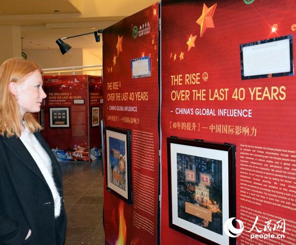 走进展览现场,巨大的红色展板立即映入眼帘。一枚枚放大的邮票镶嵌在展板上,旁边是对邮票内容的英文介绍。邮票展按照内容分为三大板块,分别为“40年的辉煌——中国经济”、“40年的进步——中国科技”和“40年的提升——中国国际影响力”。