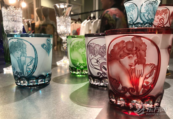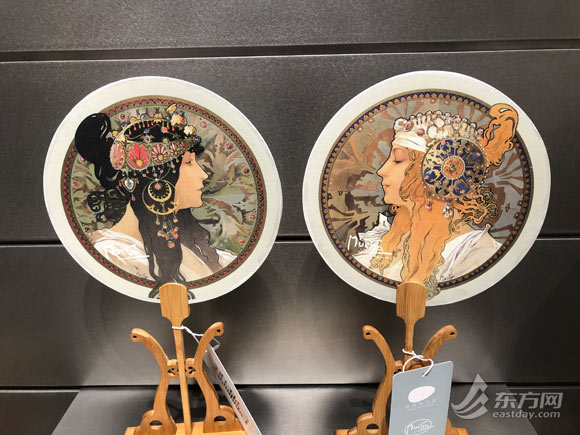 配合《慕夏》展,主办方同时推出精美的慕夏衍生品。不仅有印有慕夏画作的明信片、海报、文件夹,还有再度创造的团扇、长裙,以及来自捷克的水晶杯等。