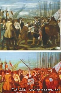 西班牙宫廷画家迭戈·委拉斯开兹(Diego Velázquez)创作于1634年至1635年的《布雷达的投降》收藏于西班牙马德里的普拉多美术馆。学者认为这是有史以来“最能够代表西班牙的绘画作品” 。达利对于这种论调非常赞同,他本身也深受早期绘画大师的影响。他坦言自己经常在普拉多美术馆通过这幅作品,感受大师的笔触。而达利对其进行的二次创作,毫无疑问是对大师经典的致敬,也是在名作基础上的重新演绎。作品中,从中间撕裂的画面、马匹身上透开的孔洞都营造出画面的超现实感,这代表着达利对于画中描绘的“投降场面”貌合神离的预见。