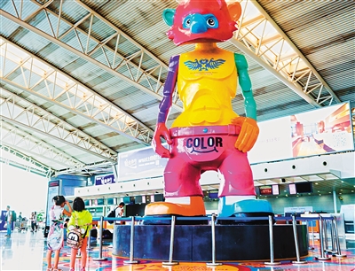 动漫展品亮相候机大厅,让乘客眼前一亮。 记者 付垚 摄 本报讯 (记者 付垚) 本月26日,一场名为“艺术空港 甜蜜启程”的动漫主题艺术展在西安咸阳国际机场举行,“大头儿子和小头爸爸”“熊猫与小鼹鼠”“极地猿人”等诸多动漫元素亮相。 据了解,本次动漫展在西安咸阳国际机场T2、T3航站楼内举行,集中在值机区、候机区及行李提取区等核心通道,展览汇聚了国内外多个经典优秀的动漫艺术形象,共有百余件展品。香港动漫大师马志雄还特别创作了一系列猿动漫作品,其中高达8米的猿人偶雕像“彩色的甜蜜微笑”十分吸引眼球,“甜蜜”主题艺术展也通过了多种表现形式,呼吁更多的人关注中国儿童健康、安全与成长问题。 据悉,本次活动展出的部分艺术作品,将在展览期间进行义卖,义卖所得将全部捐赠给中国儿童少年基金会,用于更多需要帮助的少年儿童。