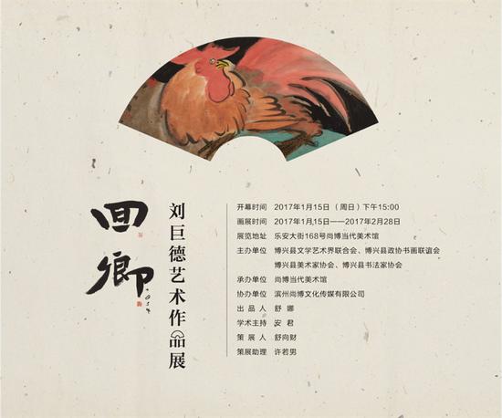 2017年元月19日下午,“回乡”刘巨德艺术作品展在山东尚博当代美术馆开幕,本次展览是刘巨德教授在山东的首次个展,由尚博当代美术馆主办,舒向财策划;共展出刘巨德先生水墨作品三十余幅及2016年新创作的雕塑陶瓷作品二十余件。其中也包括了《家乡草》、《小花猫》、《向日葵》、《黑白玉兰》等代表作,全面展现了刘巨德先生的艺术世界。