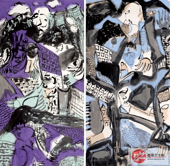 娄濛 浮城系列 136×68cm×2 纸本彩墨 2018年