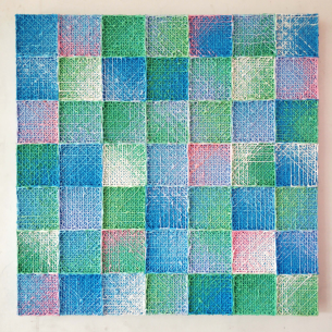 韦晓天的创作过程是一种几乎单调重复的过程,他用粗细均称的线,进行其绘画本体示的几何图案构成,画面由单色重复到红黄蓝(三原色)的重叠相混,也是运用极其规律的线体交织,叠加和重复,远观是简单的几何图形,近观会由平面一层一层慢慢地进入到一种深邃的私密空间,无疑他在追求一种纯粹的初心,希求在精神与视觉上找到一种“时空”逆旅。