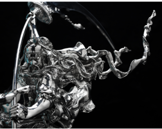 君政达(b.1987)采用不锈钢铸造工艺,他将人物和其他器具的表层都进行了手工抛光,皮肤和盔甲都呈现出镜面般的光滑质感,因此雕塑在光影下形成了丰富多彩的视觉效果。在追求视觉冲击的同时,他的作品也反映和代表了年轻中国艺术家正在用当代设计语言诠释中国传统文化,重塑艺术势力。