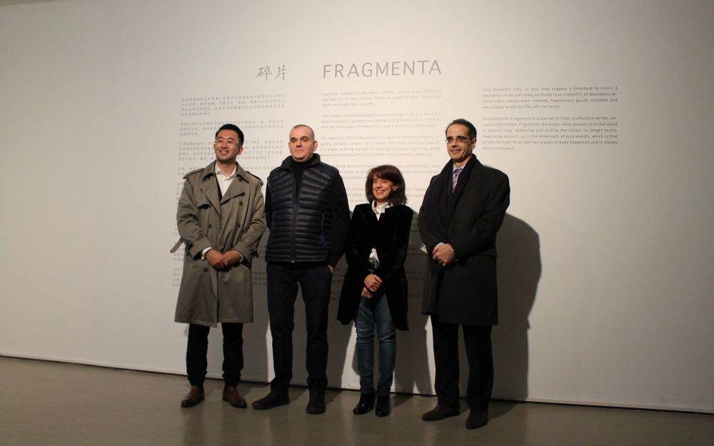 意大利驻华使馆文化中心主任孟斐璇、策展人玛丽娜、意大利艺术家契高拉尼及开幕式主持人(从右至左)合影。摄影/新京报记者 陈沁涵