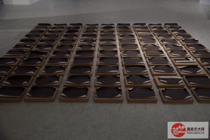 易超的作品《精卫填海》同样借用了古代神话,《精卫填海》的故事本身便体现出了华夏名族早期的海洋观。故事的背景直接发生于海洋之上,精卫乃炎帝之女,化而为鸟,立志衔西山之石而填东海。与李冰的作品不同的是,易超将其中的人文精神抽象的提炼了出来,不断的用圆珠笔塑造纸的行为本身,就是“精卫填海”的精神,精卫以其一己之力征服大海的愚公移山般的精神在易超的作品中得到了体现。易超用圆珠笔在 A4 纸上不断“塑造”,使纸张发生了受力扭曲,将四周向上的弯曲模 拟出一片片波浪,这种重复的、不断的动作造成了纸张弯曲的结果,与精卫填海的重复的、不停的动作相呼应。将每一片“浪”放置在每一个盒子基座上,受力弯曲的纸呈现出波浪形,将这样的波浪形重复摆放,塑造出海面的波涛。可以说在这个作品中,易超化身成了“精卫”,来塑造他内心的海洋。坚硬的笔不断的打磨柔软的纸片,却无法毁灭它,反而使纸改变了它的状态以更加适应笔尖的折磨,这不就是水的至柔至刚的精神吗?易超通过对神话的借用,通过抽象,劳作来完成了他对水的精神的表达。