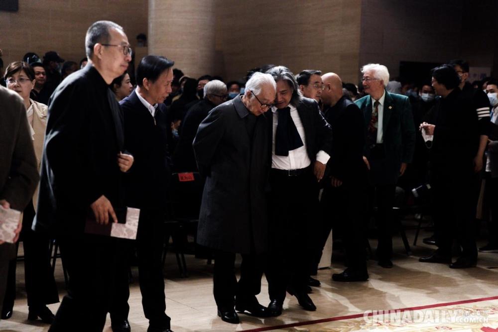10月15日,“黄河魂 赤子心——王克举百米油画长卷展”在中国美术馆开幕,图为画家王克举(中左)与中国美术馆馆长吴为山(中右)在开幕式现场交谈。(中国日报记者 姜东 摄)