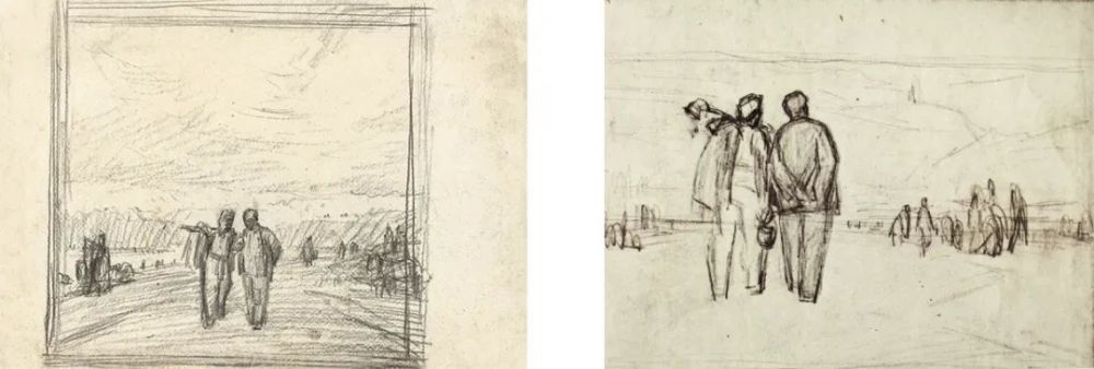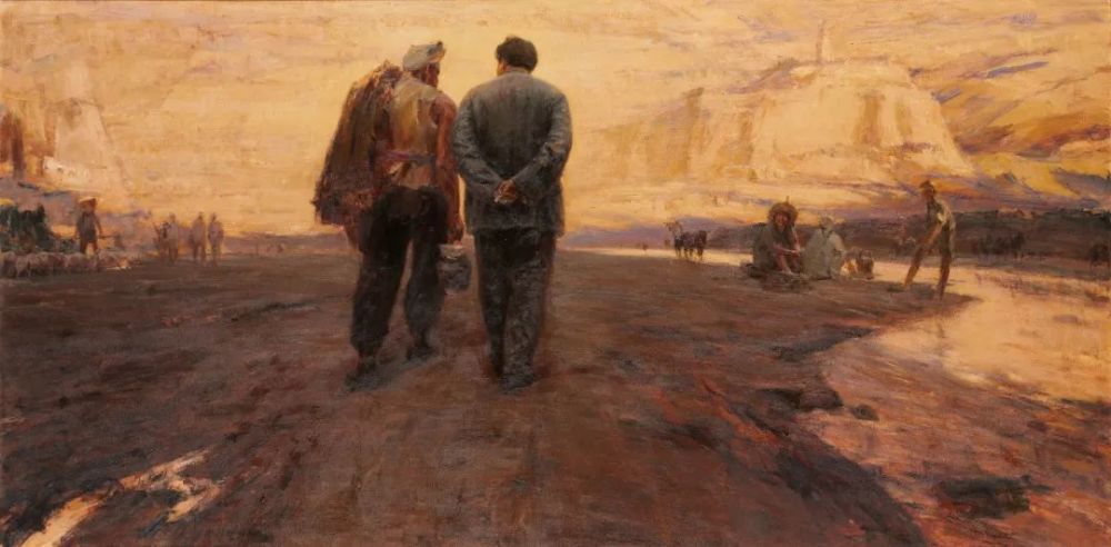 究竟这张画立意的中心是什么?自己感受最深的、最引人注目的是什么?画面的形象中分量最重的是什么?这样,我尝试着从画稿上把中景截取下来,把其余的通通删掉。突然,一个单纯的造型母题出现了:一片阳光前面的两个背影,他们谈了那么久,谈得那么亲密而深长……
