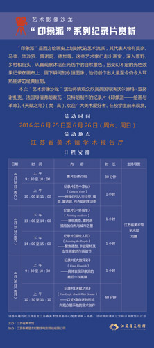 展览海报 6月24日起,由中国油画学会、江苏省美术馆、江苏省美术家协会、山东省文学艺术界联合会、潍坊市人民政府主办的《可见之诗——第二届中国油画风景展》(南京巡展)将在江苏省美术馆新馆1、2层展厅展出。本次展览将展现当代油画的风采,让观众在油画作品中领略到自然风光的秀美壮阔。展期将持续至7月5日。 李彦君-夕山-北京 王海军-我心在高原-北京 谢非-梦回故里-广东 贾见罡-蔓影摇金之醉舞秋鸿-山西 在开展当天下午2:00,中国油画学会特邀南京艺术学院教授、中国油画学会常务理事、江苏省油画学会名誉主席、艺术委员会主席沈行工先生在江苏省美术馆一楼学术报告厅举行“从容观画——谈油画的艺术表现力”的关于油画创作专题讲座。届时沈行工先生将会对于油画艺术前景的乐观期待以及油画的欣赏过程应当具有的从容心态等相关话题与大家分享。 讲座海报 电影海报 同时,为配合此次画展,江苏省美术馆将在6月25、 26日两天,陆续向艺术爱好者们推出:艺术影像沙龙之“印象派”系列的:《四个家伙》、《户外写生》、《描绘人民》、《大放异彩》、《天赋之笔》5部经典纪录片观影赏析活动。届时欢迎广大艺术爱好者们前来观展并参加相关公共教育活动。