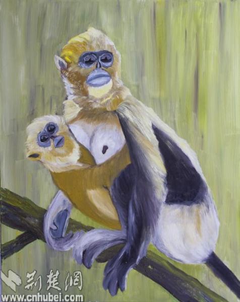 油画作者梁相斌先生介绍说,金丝猴是中国特有的珍稀灵长类动物,是湖北的“名片”,也是中国的“国宝”,近年来,湖北神农架国家级自然保护区金丝猴数量比1990年时翻了一番,表明我们国家的生态环境在不断好转,这幅油画作品《爱·金猴母子》与园林博览会的主题高度契合,与绿色生态发展理念和湖北首届园博会主旨高度契合,为湖北省首届园林博览会创作这幅作品,就是希望藉由油画艺术再现珍稀物种金丝猴的生存和繁衍,唤醒全社会对生态环境的关注,对绿色发展的重视。