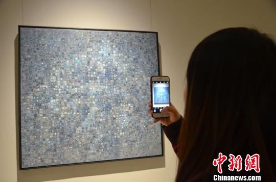 此次展览共展出103幅抽象油画艺术作品,是中国有史以来最大规模的非具象油画艺术展。图为参观者用手机拍摄抽象油画艺术作品。 郝学娟 摄