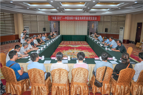 入驻仪式结束后,参会领导及艺术家代表共同走进威海宾馆,参加“中国油画小镇驻地画家座谈交流会”,针对目前中国油画小镇建设当中的亮点和不足进行了认真、细致和卓有成效地讨论。艺术家们畅所欲言,积极献言献策,与会领导求真务实,现场办公,及时拿出解决办法,座谈会受到了与会艺术家们的热烈欢迎。