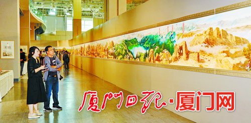 一幅长70米、高1米的新疆昌吉“天山画卷·丝路昌吉”的油画长卷在厦门美术馆展出。(记者王协云摄)