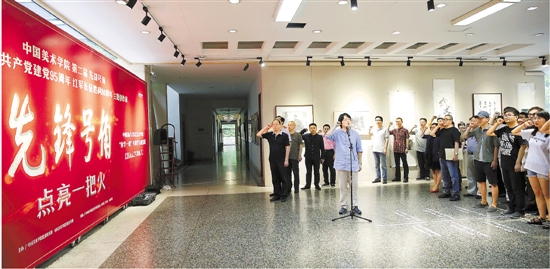 这也是由中国美院党委组织部、宣传部主办的第二届“先锋号角——点亮一把火”纪念中国共产党成立95周年暨红军长征胜利80周年主题创作展和中国画与书法艺术学院“两学一做”主题学习成果展的开幕现场。