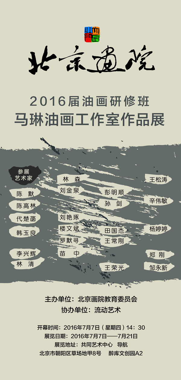 北京画院2016届油画研修班马琳油画工作室作品展7月7日在北京草场地醉库文创园共同艺术中心隆重开幕。 北京画院油画研修班是以建立学员自身审美价值和独立的创作方式为核心。通过同学们的不懈努力和对油画语言的探索精神取得了丰硕的成果。2016届的同学们来自全国四面八方,有着不同的学习经历,但他们有着同样是对艺术追求的真挚感情。在艺术表现形式多元化的今天,他们仍然选择以生活为创作基础的绘画形式,这种坚持与执着更加坚定了同学们的信念和意志,同学们在艺术实践上的实践和探寻,显示出他们对艺术的理解和最求。此次展览是同学们阶段性的成果展示,这预示着他们将开启面向未来漫长的艺术道路。相信同学们会站在新的起点,去完成他们对艺术的理想与信念,他们一定会拥有更加美好的未来。 本次油画作品展由北京画院教育委员会主办,流动艺术协办。