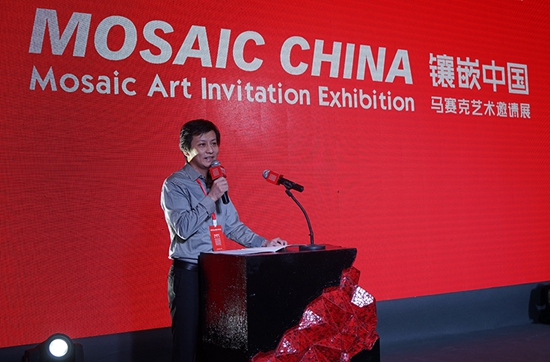 他最后介绍了此次合作的广东伟褀玻璃建材有限公司,肯定了其为北京地铁、南京大剧院、延安大剧院等多个重要的公共建筑制作的马赛克壁画,并详细说明了筹办此次马赛克艺术邀请展的过程。